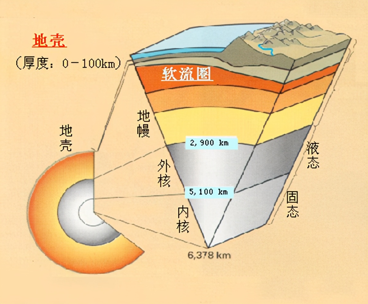 诞生之初,地球轨道上危机四伏,大量陨石散落在太空中,地球像个英勇的武士横冲直撞,花了几千年的时间终于把轨道打扫干净,体积也暴增了一倍。由于小行星不断的撞击,地心放射性元素的衰变,此时的地球是一个名副其实的岩浆球,地表时常喷出几千米高的热浪,堪称人间炼狱。随着地球轨道趋于稳定,地球温度也逐渐下降冷凝,铁、镍等重的物质向地心下沉,铝、硅等轻的物质在地壳冷却凝固,地球逐渐演化出地质圈层结构—地心、地幔和地壳。