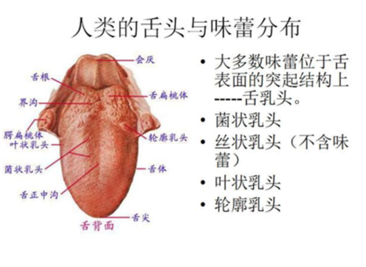 舌乳头共分4种,其中丝状乳头负责感受食物的质地,而其他三种乳突分别是菌状乳头、叶状乳头和轮廓乳头,负责感受食物的味道,从上图可以明显看出,各个乳头的分布区域不同,感受的味道也不同。