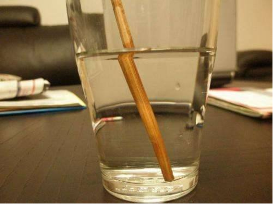 实际上这就是光折射给人的错觉,当光线从空气射入水中时,由于空气的折射率低于水的折射率,因此空气中的入射角就大于水中的折射角,于是这个筷子就不再保持笔直。