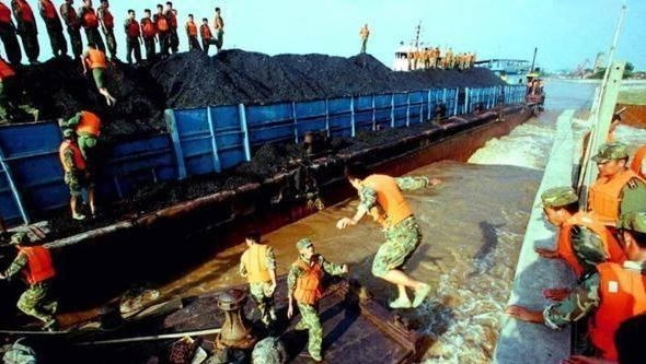 解放军战士们亟需巨大的物体沉在降低,来阻隔倾泻的洪水。