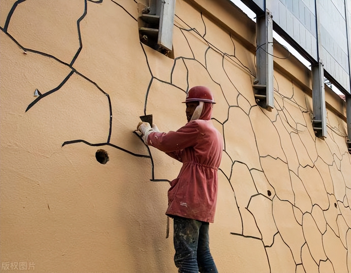 墙面“喷砂”是将特别配置的浆料喷射到墙面表层,喷料在喷完之后必须在墙面均匀分布,经过养护,达到防止开裂的目的。