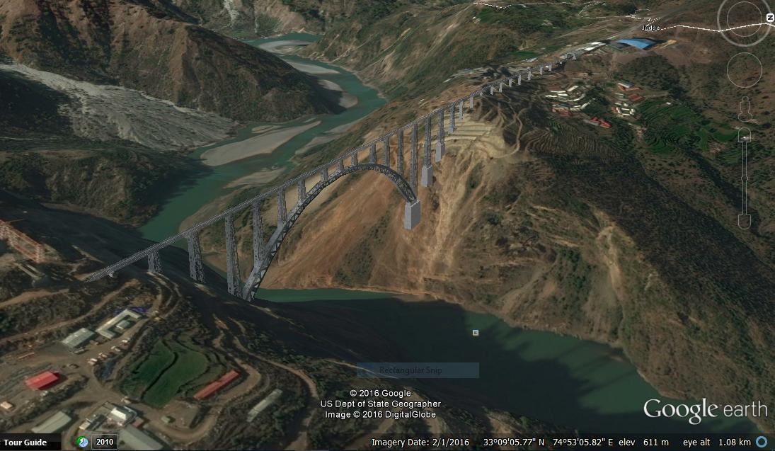 印度的这座铁路桥叫杰纳布大桥(Chenab Rail Bridge),这座大桥全长1315米,高359米,比324米高的埃菲尔铁塔高出了35米。桥面设计高度已经刷新了最高铁路桥,中国纳界河大桥320米的纪录,而且纳界河大桥的跨度仅有杰纳布大桥的四分之一左右。