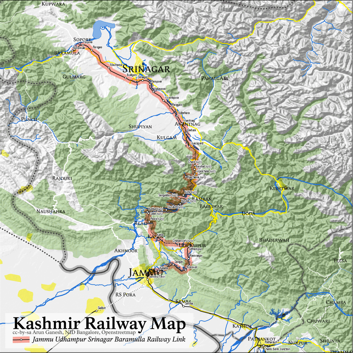 印度2002年就将这项工程列为了国家重点工程,2005年,查谟到乌丹普尔的铁路线路就已经建造完毕。但在建造杰纳布大桥时,印度遇到了前所未有的技术难题。设计师不但要考虑建筑材料的可用性、桥梁的稳固性和经济性、还要考虑到美学问题。经过建筑师一致讨论觉得,无法确保桥梁的稳定性和安全性,不得不在2008年停工,继续进行研究。