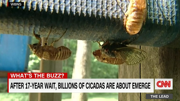 2021年5月中旬,美国东部地区发布蝉群预警,称300亿只学名叫“布鲁德X(Brood X)”的17年周期蝉即将出土,提醒美国民众提前做好防御措施。它们已经在地下蛰伏了17年,在土壤中觅食成长,会在土壤温度达到华氏64度(18摄氏度)时开始出现。