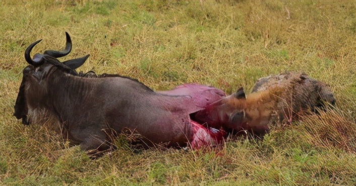 捕猎时多采用“掏肛”的方法,大部分动物的肛门都是直接连接大肠的,一旦鬣狗掏肛成功它们就会咬住不放,而被咬的动物在挣扎的过程中难免出现各种损伤,最后只能任人鱼肉。虽然鬣狗犬齿不发达,但它们裂齿咬合力却非常厉害,裂齿就是口腔后方的那些粗大平钝的牙齿,它让斑鬣狗能咬碎动物的各个器官甚至是骨骼,是斑鬣狗吃嘛嘛香的利器。