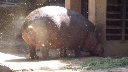 那河马为何不在岸上排泄,而是要一直泡在水里呢?这是因为河马全身几乎没有毛,也没有汗腺,虽然皮层厚度可达6cm,但是它们的皮下脂肪却很薄,身体虽然会分泌出一种红色的汗酸粘性液体,防晒并且保护皮肤免受脱水龟裂,但是效果无法维持太久,所以河马通常都在水中以及水周活动。河马在白天时会为了保持身体的湿润而待在水或者泥潭里,到了傍晚时他们才会离开水域,彻夜寻找食物,每天可吃下40~100千克的食物,这也是它们的排泄量相当可观的原因。